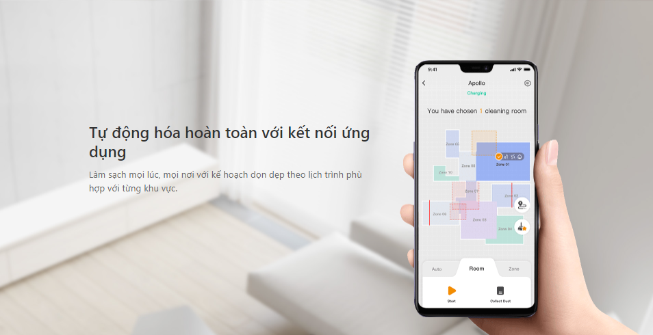 Robot tự quay về trạm sạc khi kết thúc phiên làm việc, hoặc khi gần hết pin. Nếu trước đó chưa dọn xong, Robot sẽ tự động tiếp tục làm việc khi đã sạc đầy.